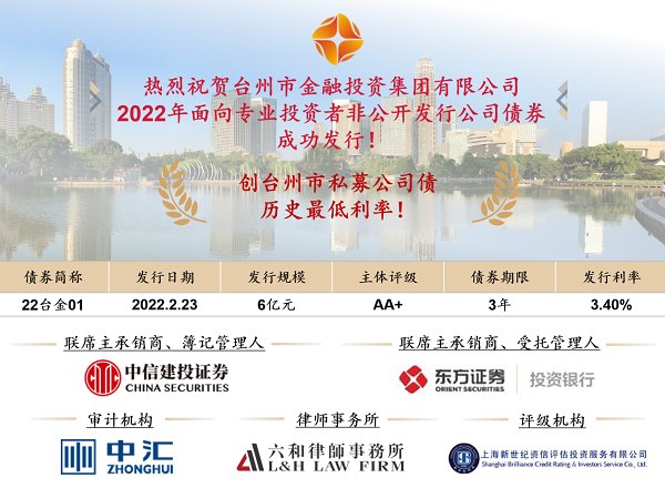 本次私募公司債是市金投集團在境內資本市場的再一次閃耀亮相,是積極踐行浙江堅持“八八戰(zhàn)略”再深化、改革開放再出發(fā)的重要舉措。此次募集資金將為臺州市產業(yè)提質賦能、推動創(chuàng)業(yè)創(chuàng)新、助力實體經濟發(fā)展提供有力支持和保障。