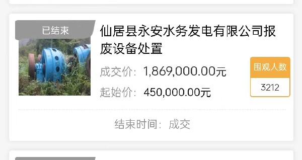 自統(tǒng)一全市國有資產(chǎn)公開交易平臺以來,11月20日,仙居首宗項目——仙居縣永安水務(wù)發(fā)電有限公司報廢設(shè)備處置成功高溢價成交。該項目起拍價45萬元,經(jīng)573輪次競價,最終成交價186.9萬元,溢價率高達(dá)315.33%,創(chuàng)下2023年以來新高。