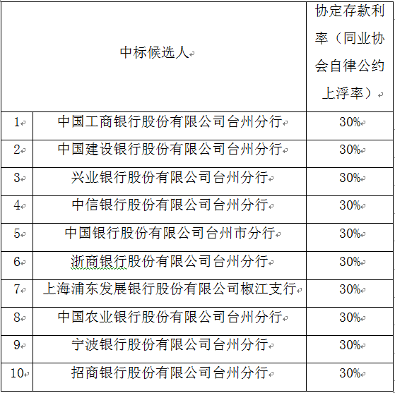 臺州市金融投資集團有限公司(招標(biāo)人), 臺州市金融投資集團有限公司戰(zhàn)略合作銀行及下屬公司存款競爭性存放項目,經(jīng)評標(biāo)委員會評審,結(jié)果公示如下: