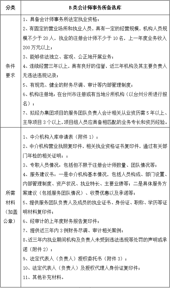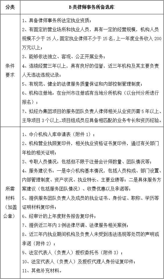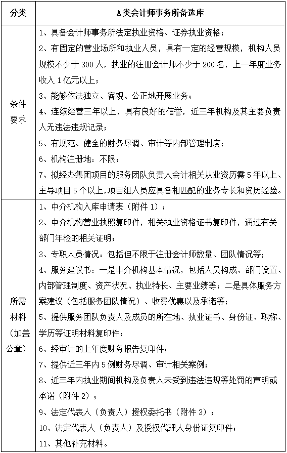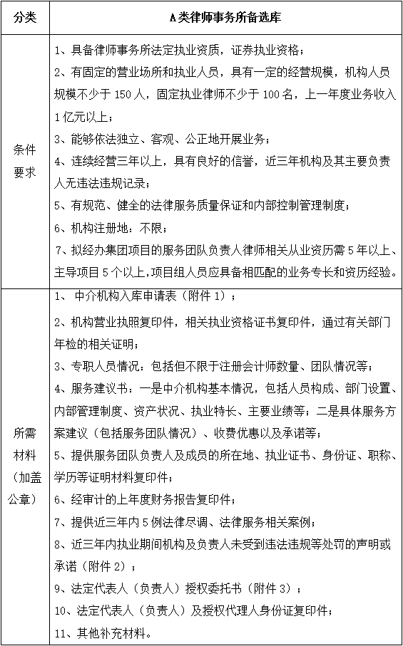 為更好的滿足集團財務(wù)審計、財務(wù)盡調(diào)、法律服務(wù)、法律咨詢等專業(yè)服務(wù)需求,集團擬對會計師事務(wù)所、律師事務(wù)所備選庫開展中介機構(gòu)入庫申報選聘工作,現(xiàn)將有關(guān)事項公告如下: