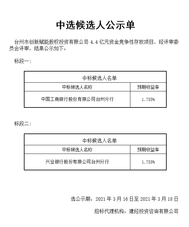 臺(tái)州市創(chuàng)新賦能股權(quán)投資有限公司4.4億元資金競(jìng)爭(zhēng)性存放項(xiàng)目中選候選人公示單