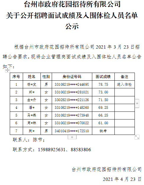 臺州市政府花園招待所有限公司關于公開招聘面試成績及入圍體檢人員名單公示