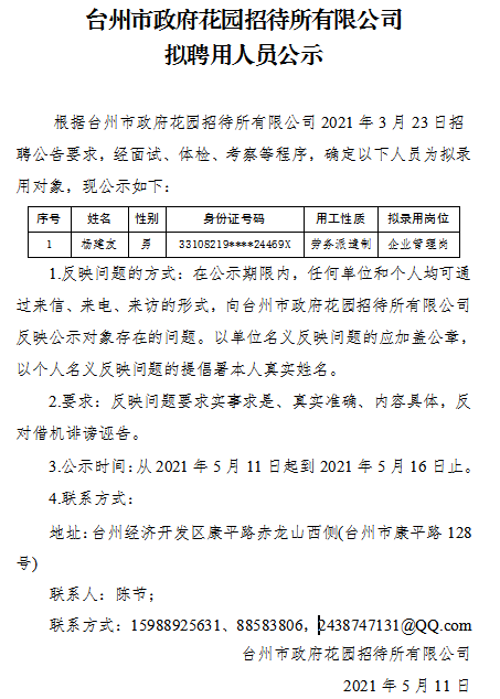 臺(tái)州市政府花園招待所有限公司擬聘用人員公示