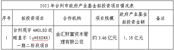 根據(jù)《臺州市政府產(chǎn)業(yè)基金管理辦法》(臺財(cái)企發(fā)〔2021〕6號)等有關(guān)規(guī)定,為發(fā)揮政府產(chǎn)業(yè)基金引領(lǐng)作用,臺州市政府產(chǎn)業(yè)基金擬投資的1個項(xiàng)目(定向基金),已由臺州市金融投資集團(tuán)有限公司決策委員會(基金管理委員會)審議通過,現(xiàn)將擬投資項(xiàng)目予以公示。如有意見,可向市金投集團(tuán)反映。