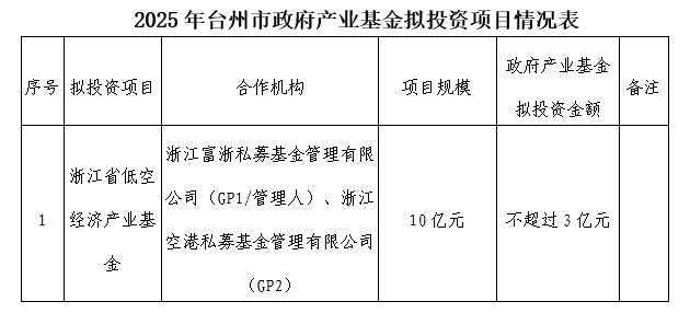 根據《臺州市政府產業(yè)基金管理辦法》(臺財企發(fā)〔2021〕6號)等有關規(guī)定,為充分發(fā)揮政府產業(yè)基金引領作用,臺州市政府產業(yè)基金擬組建非定向基金投向低空領域,已由臺州市金融投資集團有限公司決策委員會(基金管理委員會)審議通過,現予以公示: