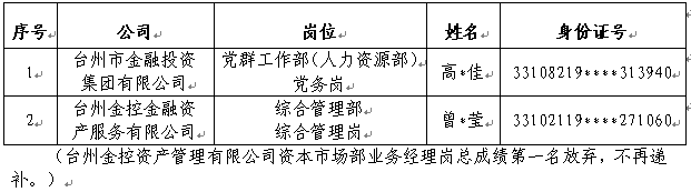 根據(jù)2023年4月27日發(fā)布的《臺(tái)州市金融投資集團(tuán)有限公司及所屬企業(yè)公開招聘7名工作人員的公告》要求,經(jīng)公開報(bào)名、面試、體檢和考察等程序,確定以下人員為擬錄用人員,現(xiàn)公示如下: