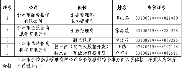 根據(jù)2023年6月16日發(fā)布的《臺(tái)州市金融投資集團(tuán)有限公司所屬企業(yè)2023年夏季招聘公告》要求,經(jīng)公開報(bào)名、面試、體檢和考察等程序,確定以下人員為擬錄用人員,現(xiàn)公示如下: